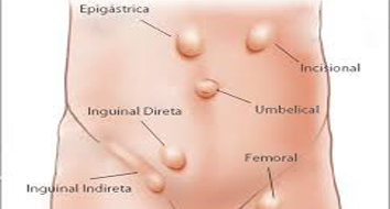 Temos as hérnias inguinais, hérnias umbilicais e hérnias epigástricas que são as hérnias da linha média.